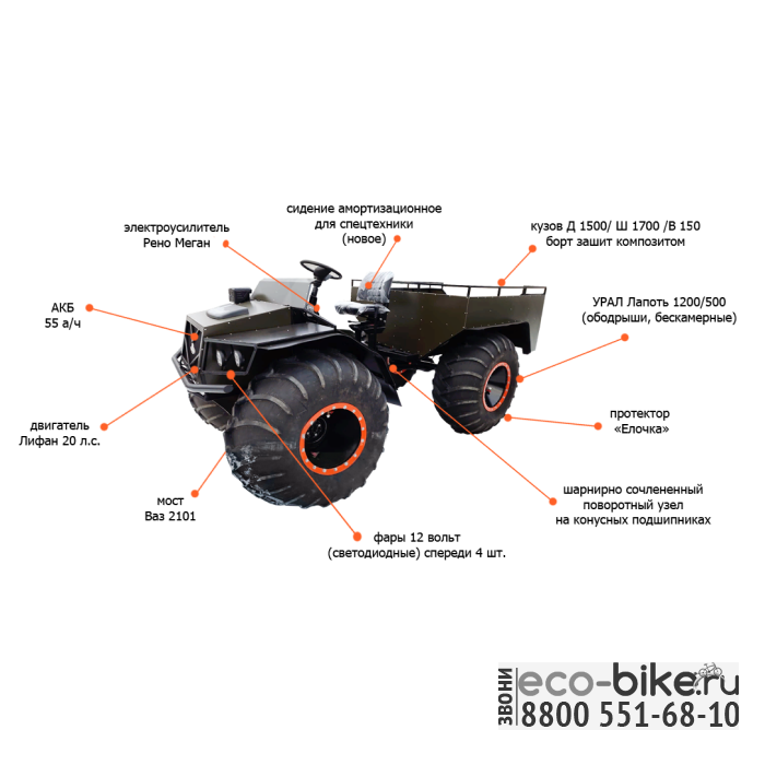- Колеса: УРАЛ Лапоть 1200/500 (ободрыши, бескамерные), протектор «Елочка»